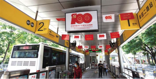 在果园二路两个站台的尽头,还有一个建党百年的红色展牌,上面有黄色锤子、镰刀的党徽图案,发出金黄色的光,象征着照亮社会,传播大爱,不少市民驻足与之合影留念。