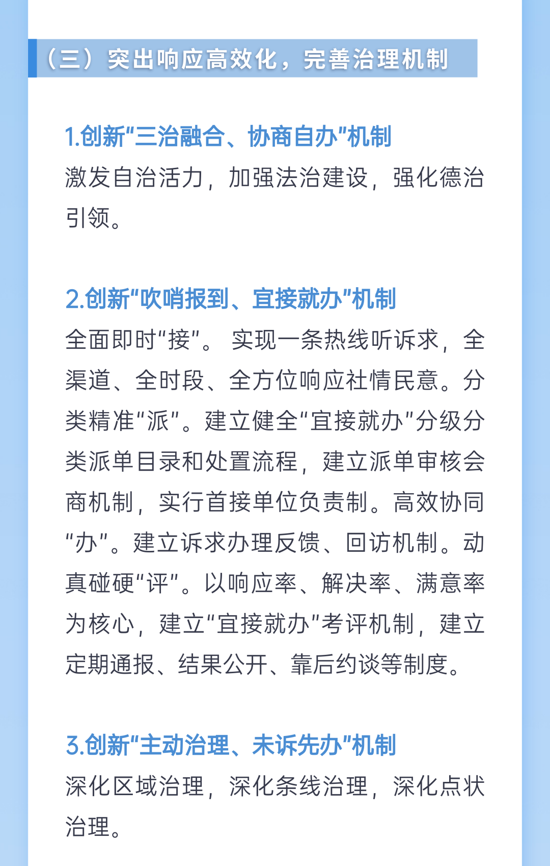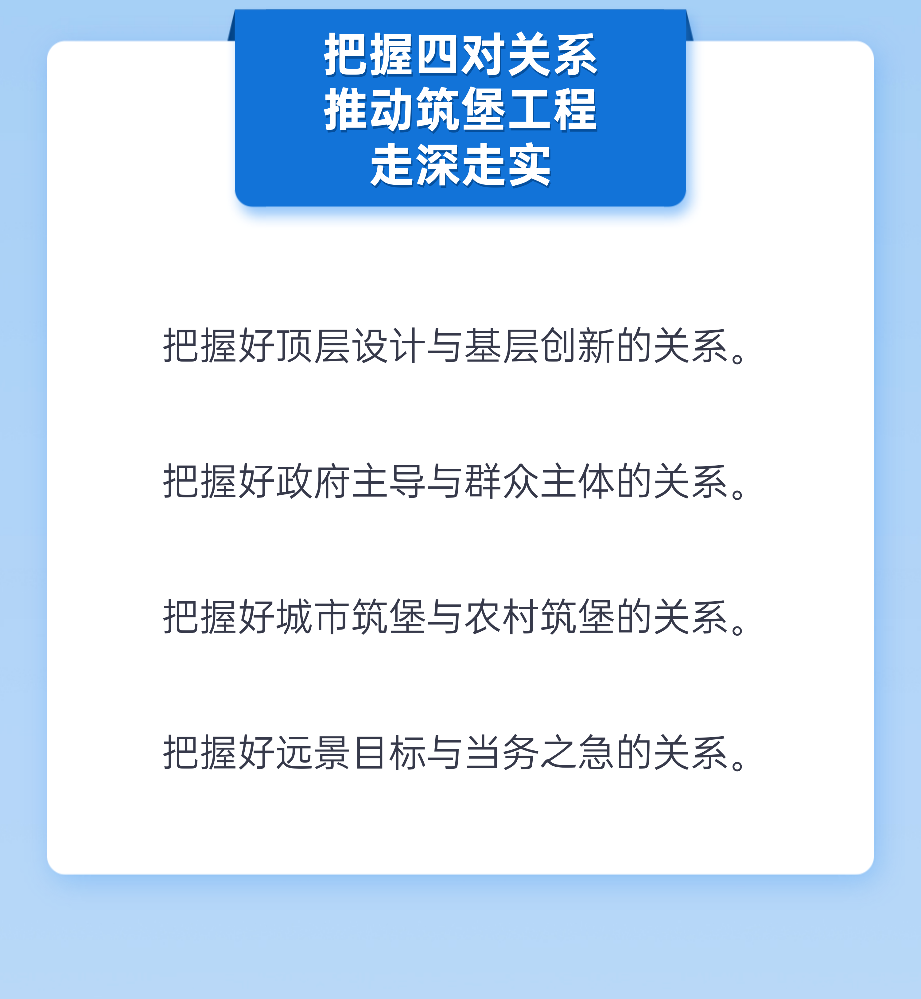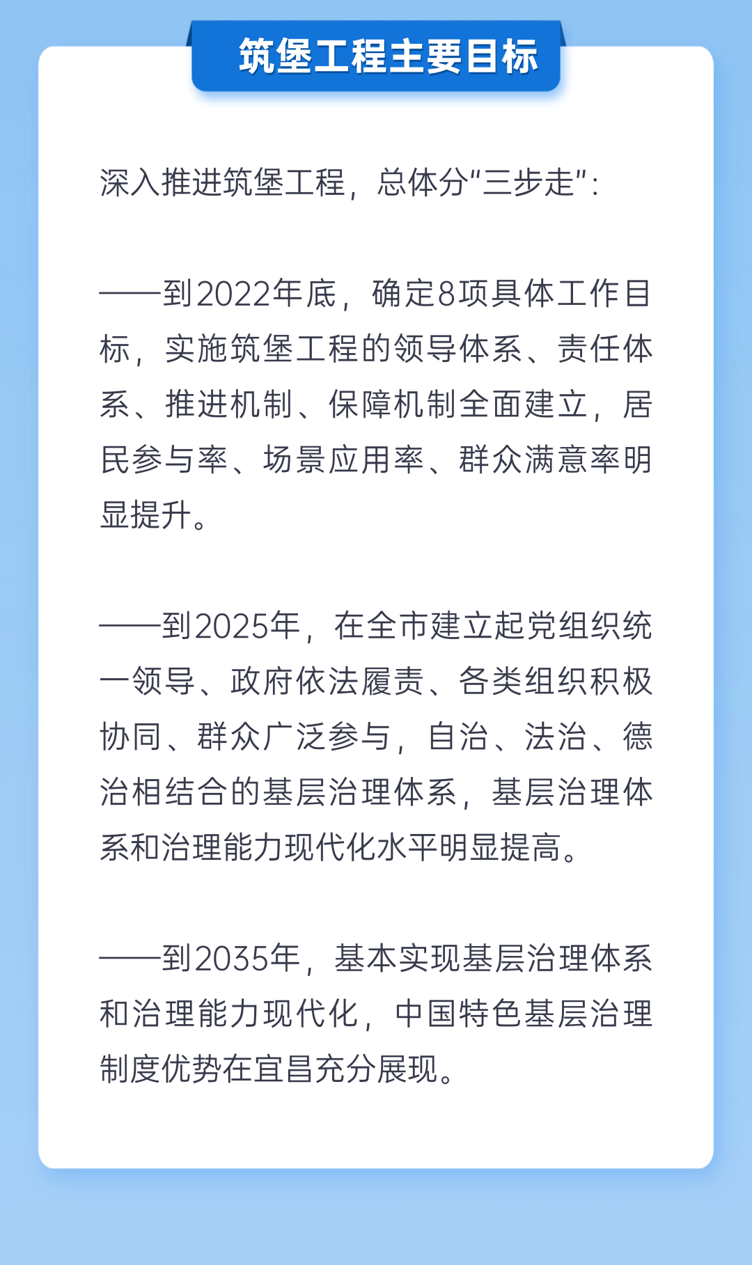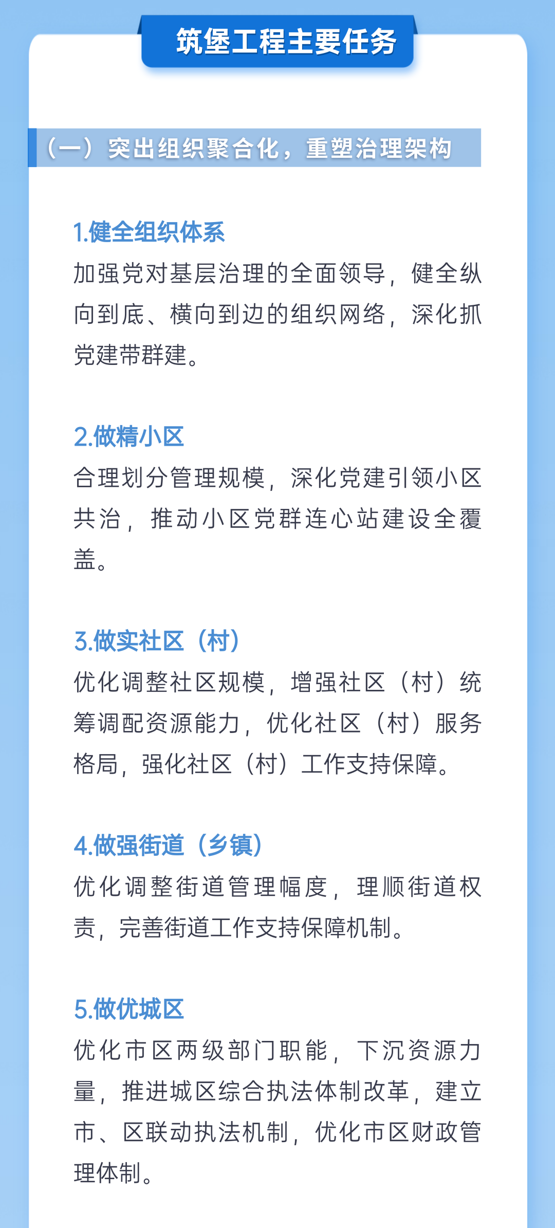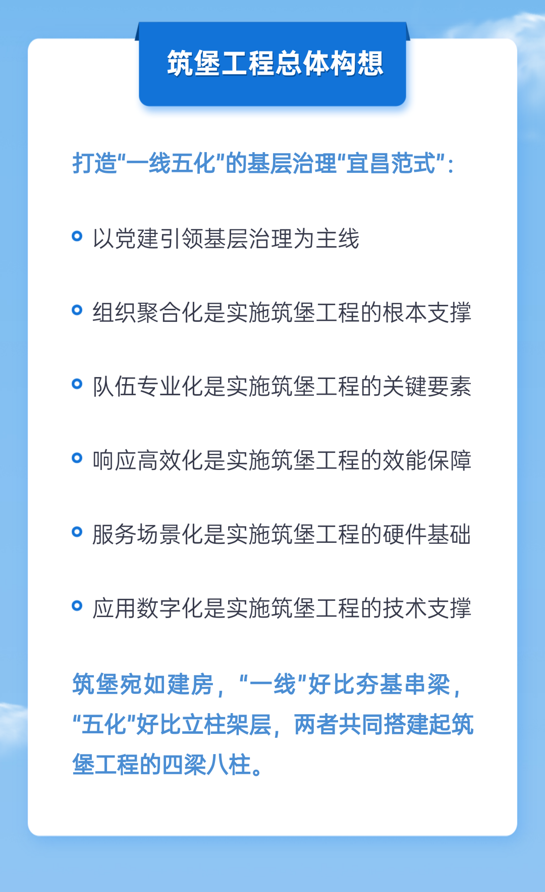 去年8月,市委正式提出并在全市大力实施筑堡工程,研究谋划的方向、切入点、视角,正是对准基层这个矛盾之“源头”、疏导之“茬口”。今年4月29日,市委、市政府印发《关于实施筑堡工程加快基层治理体系和治理能力现代化建设的意见》,正式提出了打造“一线五化”的基层治理“宜昌范式”。