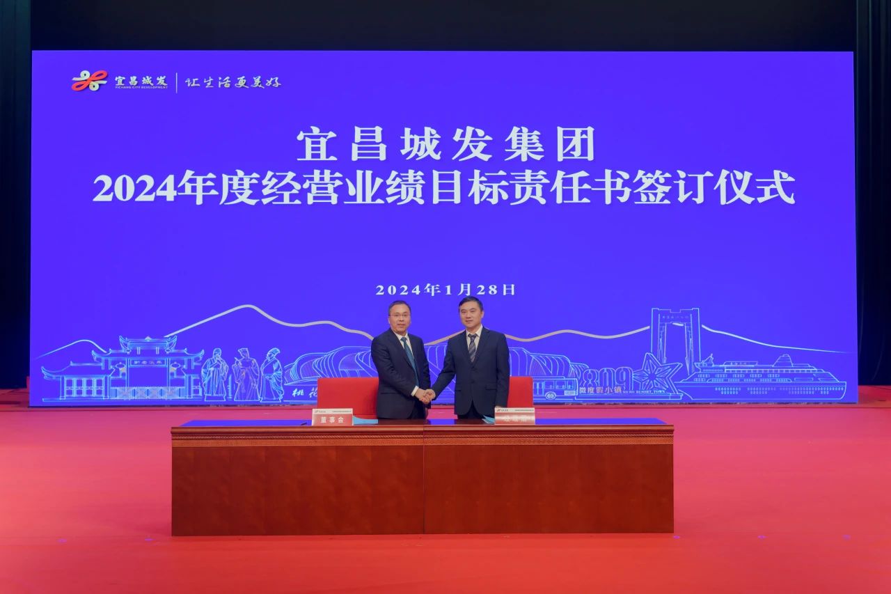 殷俊代表集团董事会与集团党委副书记、总经理徐强签订了《宜昌城发集团2024年度经理层经营业绩目标责任书》,徐强代表集团经理层与各专业化(直管)子公司签订了《2024年度经营业绩目标责任书》。