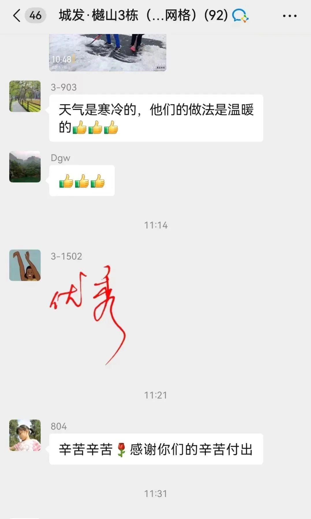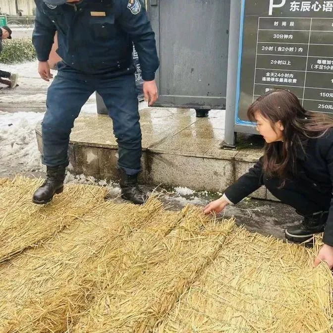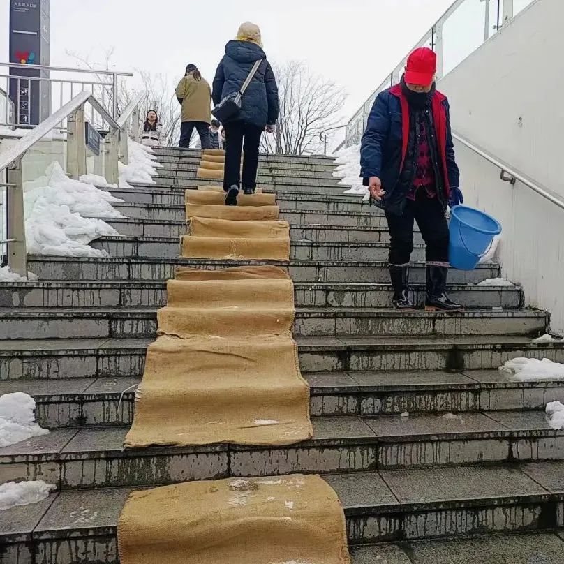 同时,及时清理服务小区主干道、楼栋入口处、人行道、车辆出入口等处积雪,在人行通道处铺上麻袋、草垫防滑,温暖业主出行回家路。