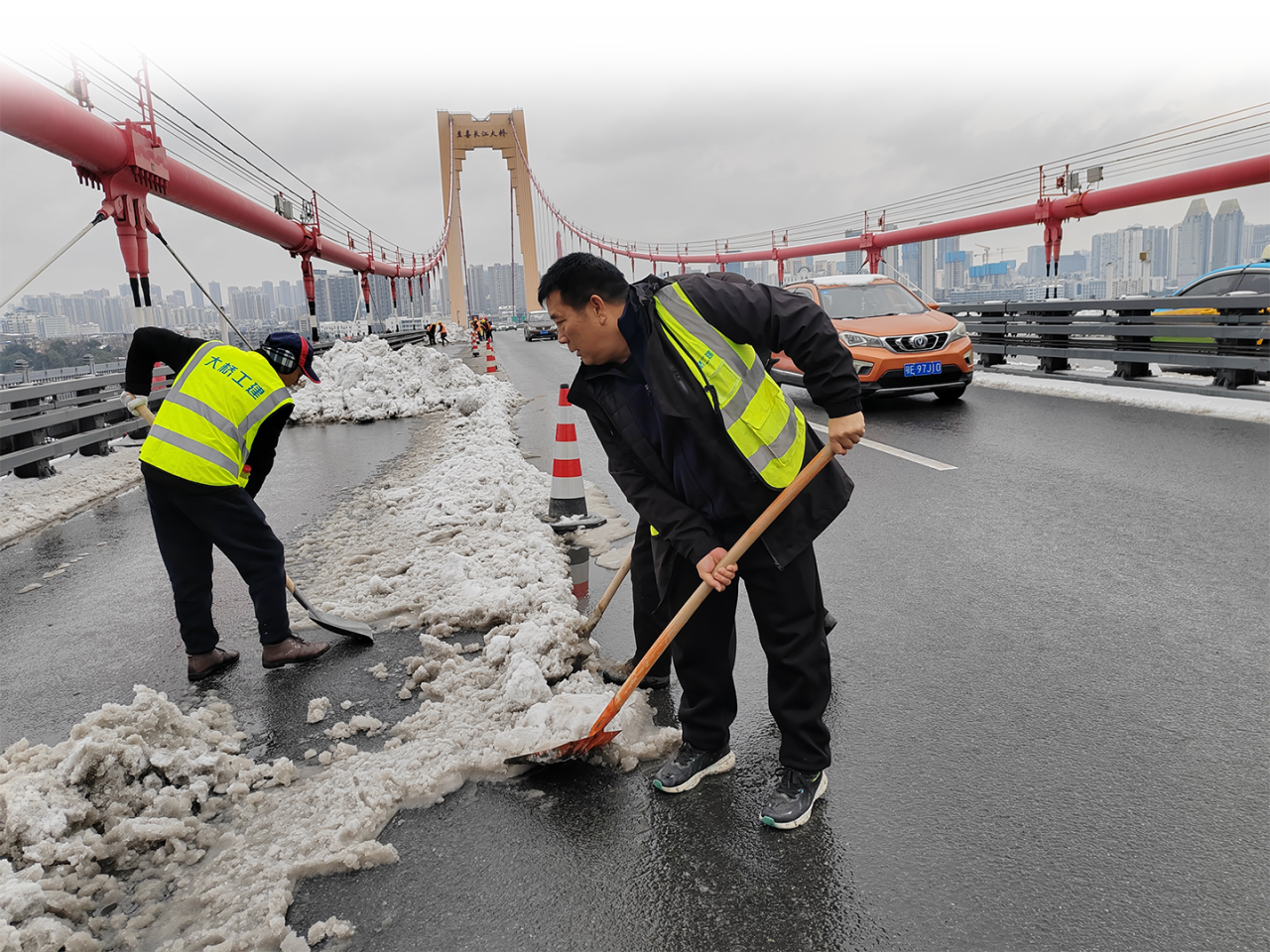 “大家抓紧时间,争取天亮前先把超车道抢出来!”2月4日6点,宜昌长江公路大桥上,一群人正拿着铁锹卖力地铲除桥面上的冰雪。他们,来自于大桥集团临时组建的应急备勤队伍。