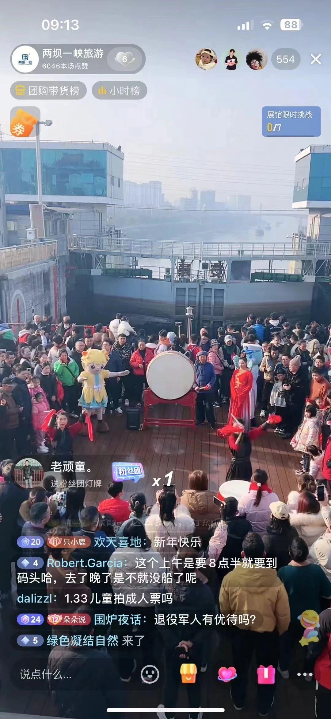 2月11日-2月14日,关注抖音“两坝一峡旅游”直播间加粉丝灯牌,购两坝一峡或长江夜游成人票2份,赠送定制新春好礼1份;全天不定时抽奖赠送福利、夜游兑换券等。