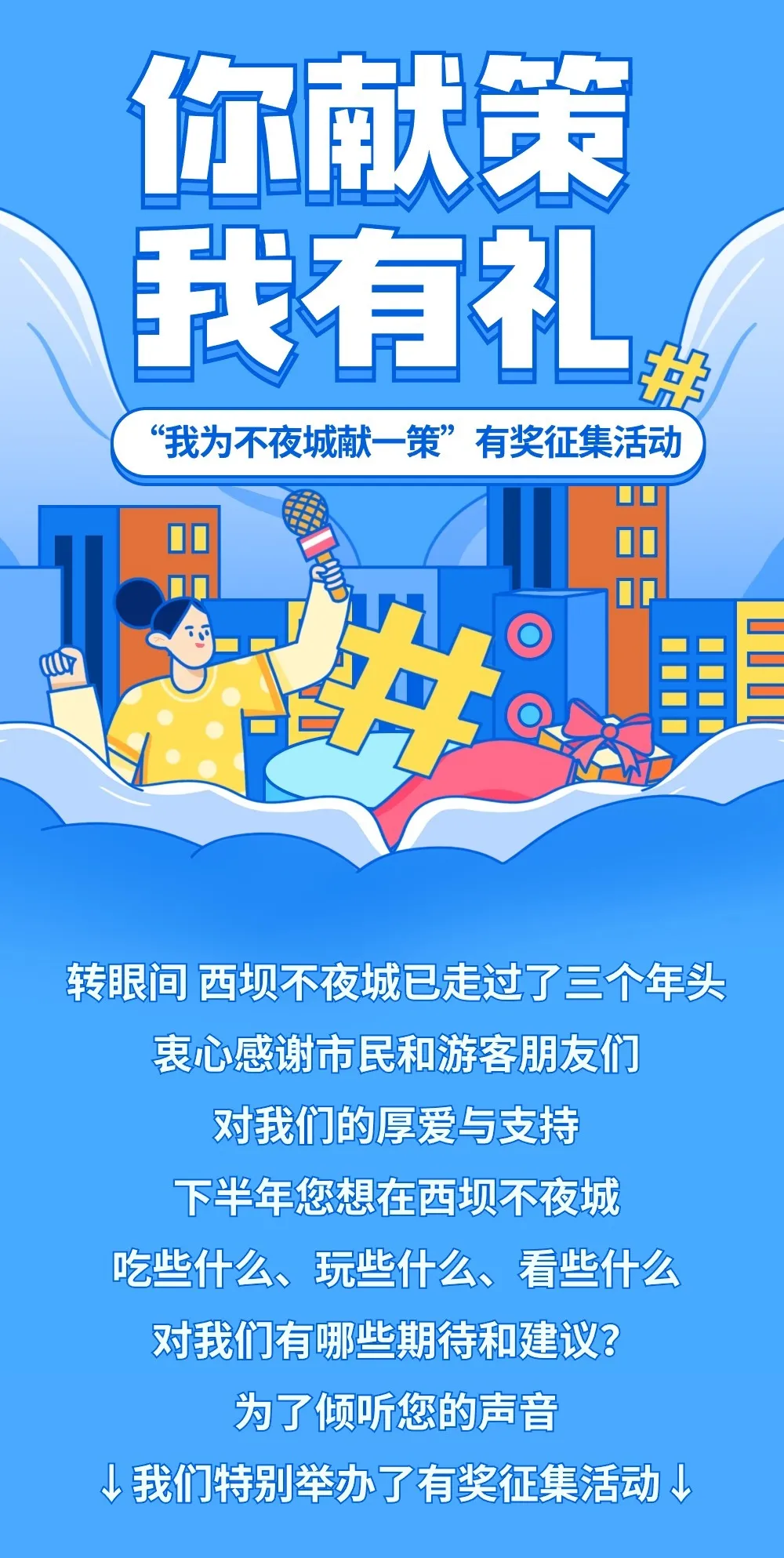 可从你想在西坝不夜城看见的新兴业态、想在这里享受到的公共服务和营商环境,或者是你能想到超绝的宣传口号或slogan!可畅谈西坝不夜城的未来规划也可对现有商家、营销活动、配套设施等方面提出问题和解决思路。亦可提供同行业先进案例……言之有理,具备经济性、可行性皆可!