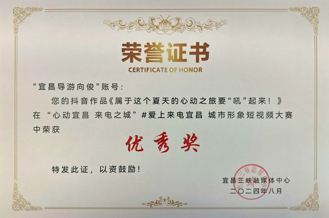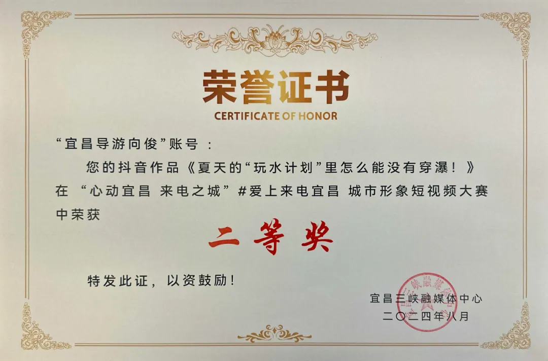 经过评选,湖北抖乐科技发展有限公司报送的“宜昌导游向俊”抖音作品《夏天的“玩水计划”里怎么能没有穿瀑!》和《属于这个夏天的心动之旅要“吼”起来!》,分别获得二等奖、优秀奖。