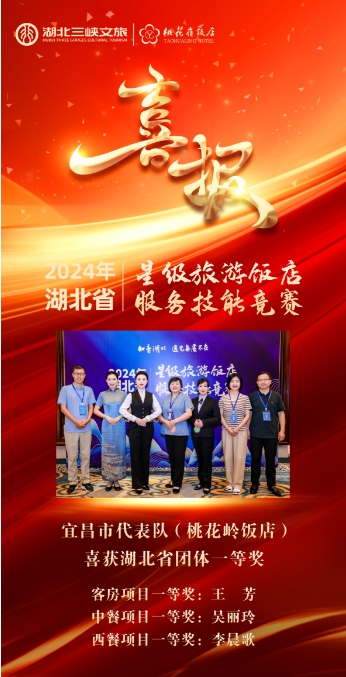 本次竞赛有前厅服务、客房服务、中餐服务、西餐服务4个技能项目。桃花岭饭店派出王芳、吴丽玲和李晨歌加入宜昌市代表队进行参赛,经过努力拼搏,王芳荣获客房服务项目一等奖、吴丽玲荣获中餐服务项目一等奖、李晨歌荣获西餐服务项目一等奖,宜昌市代表队以总分第一名的优异成绩荣获团体一等奖。