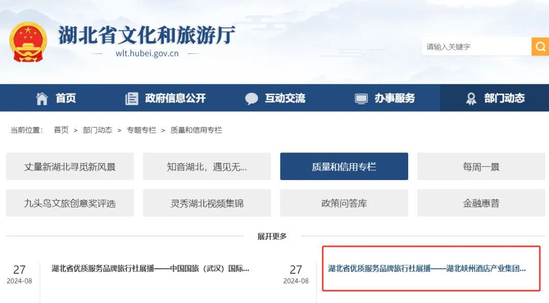 旗下峡州集团海峡国旅荣获“湖北省优质服务品牌旅行社”称号,并作为首批十家旅行社之一在湖北省文化和旅游厅官网上进行展播和宣传。