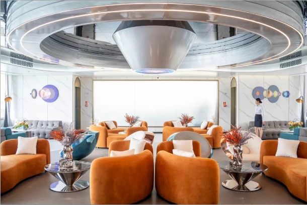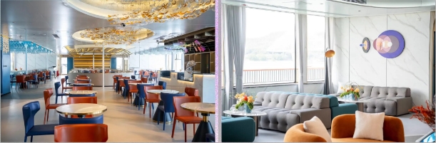 游轮内部装饰采用多元设计风格,其部分流线型结构灵感来源于长江的自然风光,创造出自然与艺术的和谐共鸣。在功能设计与美学表达之间取得了平衡,为宾客打造了一个内外和谐、风格独特、质感统一的高端舒适水上活动空间。
