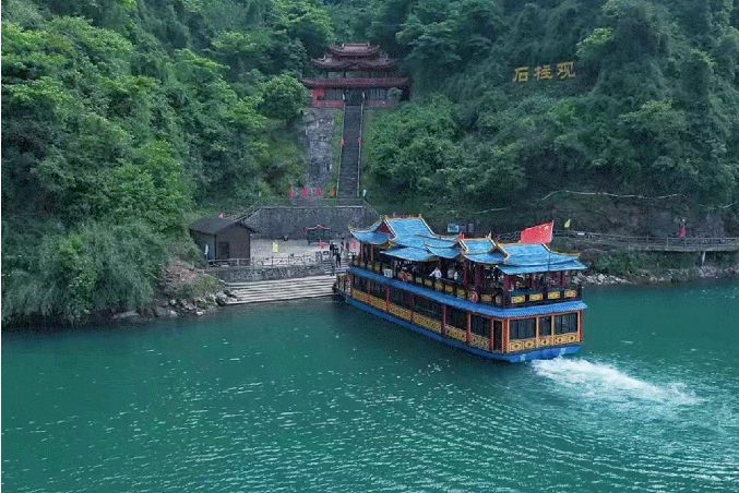 一湖净水在天龙湾蜿蜒展开,在这里游客们乘仿古游船畅游清江美景和秋色。登石柱观,舒展身心登高、赏菊、观清江美。