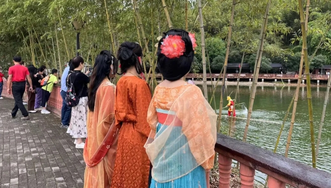 拍照不需要挑背景啦!咔嚓一下都是大片美图~不只是视觉的享受,更有心灵的震撼!非遗表演【水上独竹漂】带领游客领略传统文化的独特魅力,还有身着汉服的花仙子在园区内巡游,游客们还能与她们合影留念呢~旗袍协会还为现场的游客们准备了精彩的旗袍秀和舞蹈表演。