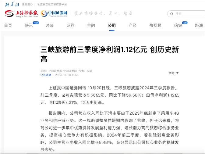 10月20日晚,三峡旅游披露2024年三季度报告。前三季度,公司实现营收5.56亿元,同比下降56.58%;归母净利润1.12亿元,同比增长7.21%,创历史新高。