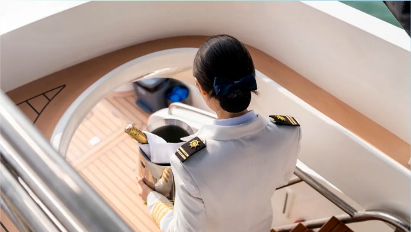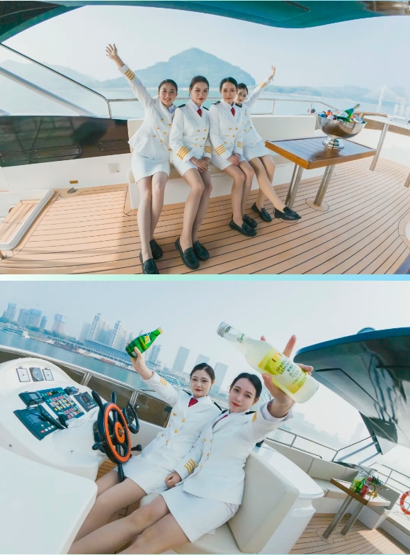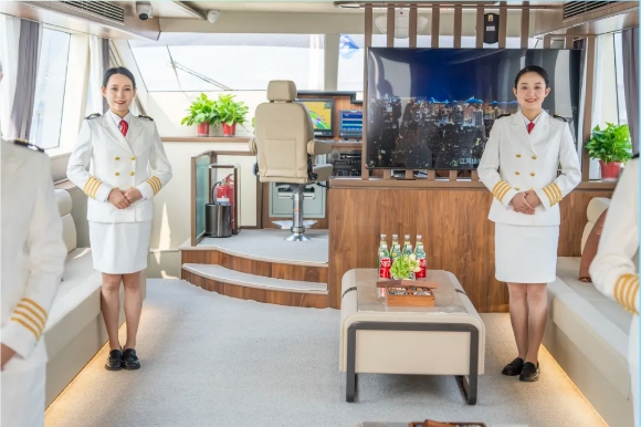 一层甲板连通宴会厅,宽敞通透。顶层甲板视野开阔,遮阳防晒顶棚,江天一色尽揽入怀。