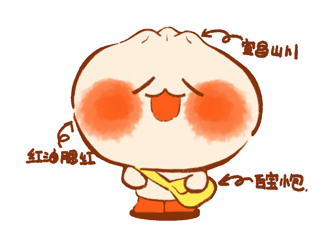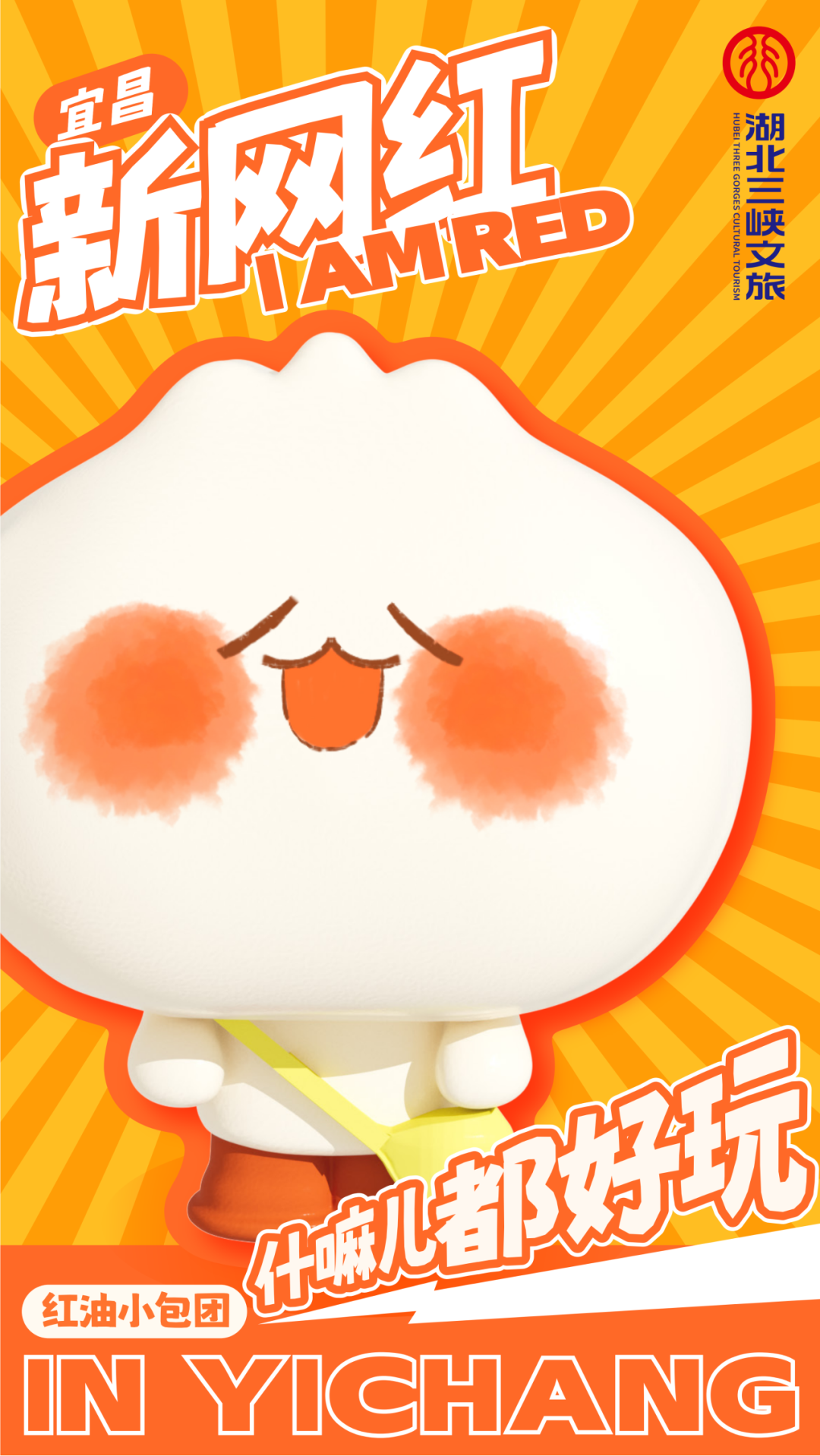 “红油小包”灵感来源于宜昌特色美食“红油包子”;“小包团”代表我们的旅游精品小团;头顶的褶皱,形似宜昌连绵的山川;斜挎的百宝小包是现实版哆啦A梦口袋。