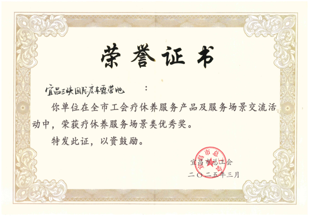 三峡国际房车露营地是全国五星级房车露营地、全国首批5C级自驾车旅居车营地,集精品房车、野奢木屋、生态露营、自助烧烤、自驾旅游、休闲养生、森林探险、会议会展、团建拓展等为一体。2021年1月8日,中国旅游车船协会公布了首批国家级4C、5C自驾车旅居车营地,全国入选4C、5C自驾车旅居车营地共15家,其中5C营地全国仅6家,宜昌三峡国际房车露营地成为华中地区唯一一家入选营地。