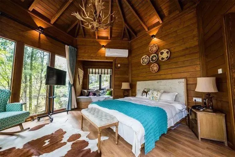 它个性十足,处处皆是“孤品”。作为全国知名山地型房车露营地,无论是外部设计,还是内部装修,无处不在彰显着它的与众不同。仿真瓦顶、茅草顶、帐蓬顶等各式木屋依次隐匿在林间。