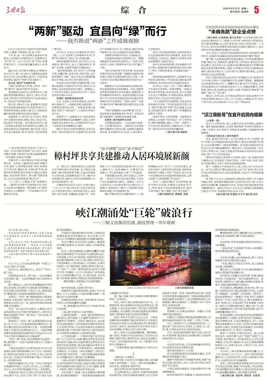 6月10日,辽宁沈阳游客吕娜一早登上了“长江三峡 5号”游轮。8时30分,游轮溯江而上,开启了“两坝一峡”之旅。吕娜闲适地坐在三层卡座,一边品尝着宜红茶和橙子酥,一边欣赏着窗外城市风景掠过天际线。船行碧波江上,她时而体验舞蹈演员带来的土家风情,时而惊叹“水涨船高”的神奇魅力,时而欣赏三游洞陈毅“三峡天下壮,请君乘船游”摩崖石刻,时而感受西陵峡的鬼斧神工。吕娜说:“‘两坝一峡’既能感受到过船闸独特体验,又能欣赏三峡风光和三峡大坝,这种旅游体验在全国只此一家,游轮的环境和体验都很棒,我很喜欢。”作为一名从珠江到日喀则,从黄浦江到马来西亚游玩过众多城市的旅游达人,她在社交媒体对宜昌和“两坝一峡”发出了“乘兴而来,尽兴而归”的赞美。
