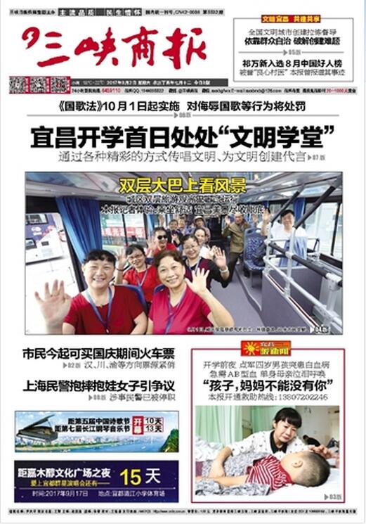 9月1日上午,宜昌交旅观光一号线首发仪式在城区均瑶广场举行。周身绘制宜昌特色景点的城市旅游观光巴士为上下双层、58座设置,座位柔软舒适,二层车顶设有全景天窗,可供游客全方位赏景。城市旅游观光巴士是继“两坝一峡”“交运·长江夜游”游轮产品、空中游宜昌低空游产品之后,宜昌重磅推出的又一城市旅游产品,将助推宜昌形成“水、陆、空”皆可游的立体旅游发展格局。
